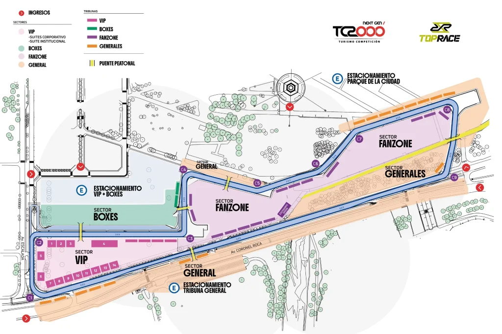 El circuito comienza en la recta principal sobre la avenida Coronel Roca, uno de los sectores más rápidos del trazado. Allí los autos del TC2000 tendrán espacio para desarrollar velocidad antes de llegar a una fuerte frenada que los lleva hacia el sector más trabado del circuito.