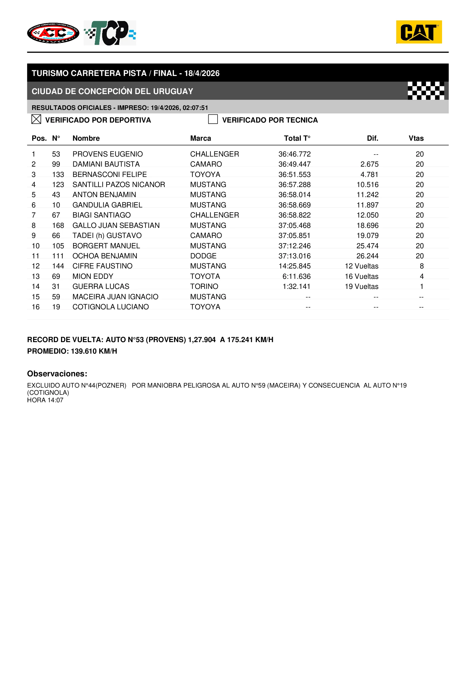La cuarta fecha del campeonato 2026 de TC Pista culminó con la victoria de Eugenio Provens (Dodge Challenger), quien se impuso de principio a fin en la Final disputada en el Autódromo de Concepción del Uruguay. De esta manera, el piloto del Galarza Racing consiguió su primera victoria en su cuarta carrera en la categoría.