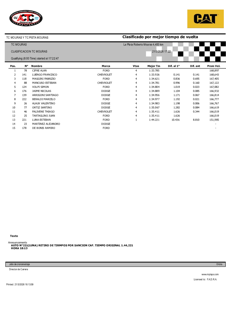 Se cerró la actividad sabatina de la tercera cita del certamen 2026 de TC Mouras en el Autódromo «Roberto José Mouras» de La Plata (Buenos Aires) con la prueba clasificatoria, en la cual el más veloz fue Alan Denis Cifre.