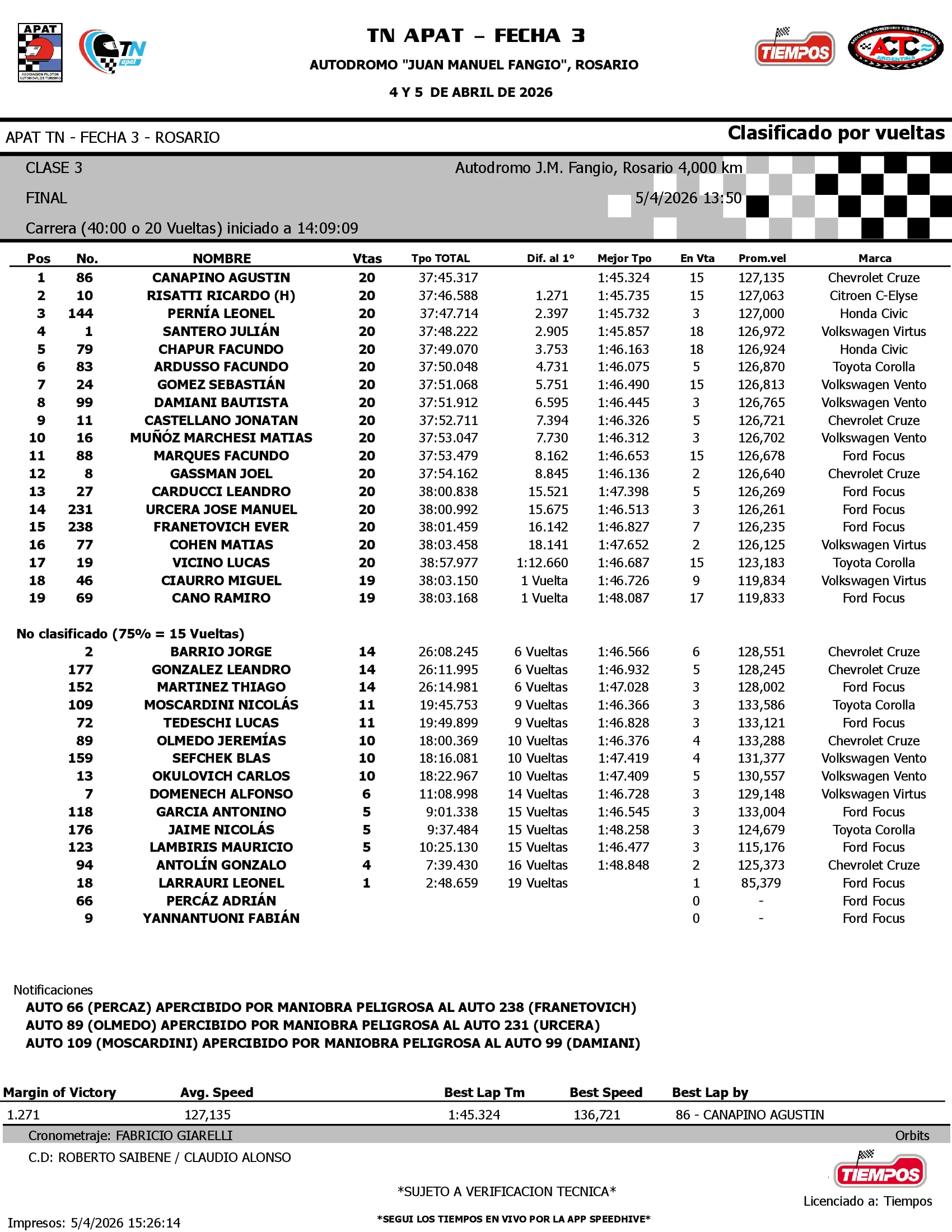 Con 30 kilos de lastre en el Cruze que alista el staff técnico del Canning Motorsports, Canapino sumó su tercer triunfo en seis carreras disputadas como titular en el TN Clase 3 y ganó cuatro posiciones en el campeonato para situarse como escolta de Facundo Chapur (Civic), a cinco puntos del líder. El cordobés del Larrauri Racing, que venía de ser tercero en Paraná y sexto en Villa Parque Santa Ana, llegó quinto en Rosario luego de largar desde la séptima posición.