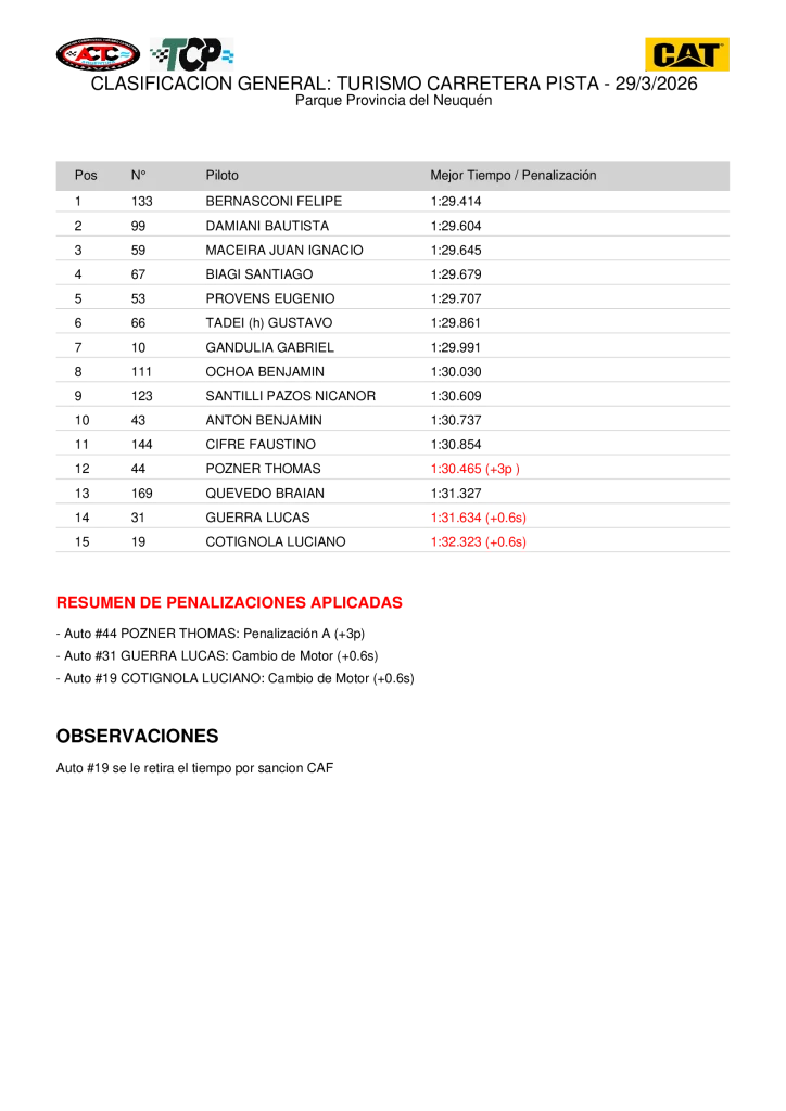Felipe Bernasconi (Toyota) sorprendió en la clasificación del TC Pista en el Autódromo Parque Provincia del Neuquén en Centenario y se quedó con su primera «pole position» en 17 participaciones en la categoría, que está desarrollando el tercer capítulo del campeonato 2026. Es la tercera «pole» para la marca japonesa en el TCP, luego de las conseguidas por Hernán Palazzo (Termas de Río Hondo 2023) y Diego Azar (Posadas 2024).
