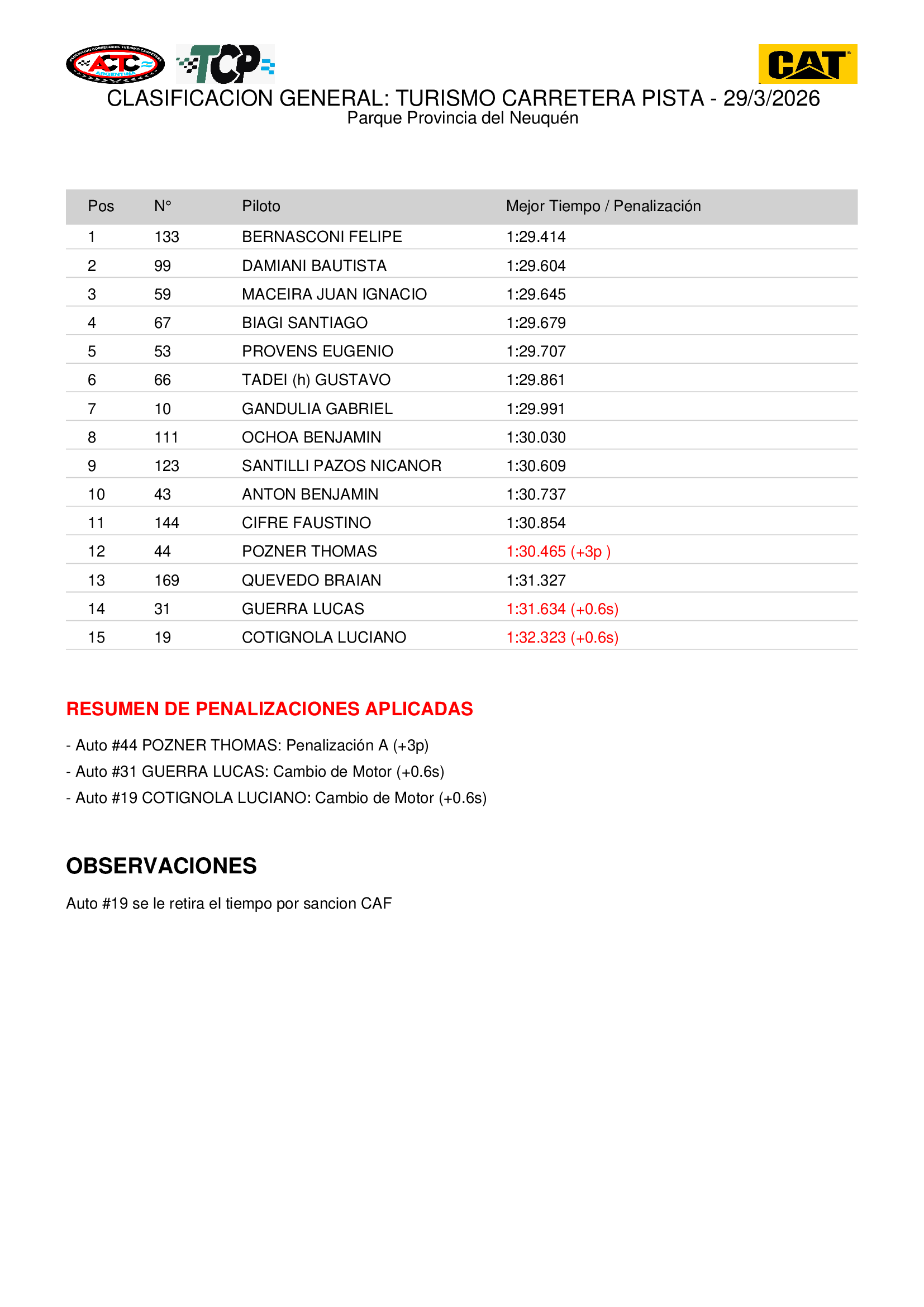 El piloto del JMB Competición, que disputó su primera temporada en el TC Pista con Torino y desde este año lo hace con Toyota, había sido séptimo y segundo en los entrenamientos de hoy. En la última práctica escoltó a Bautista Damiani (Chevrolet Camaro), a quien desbancó de la cima en la clasificación con un tiempo de 1m29s414.