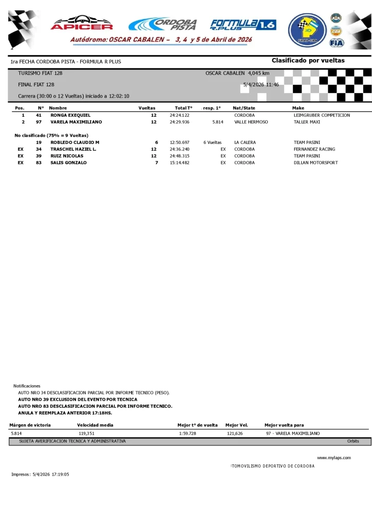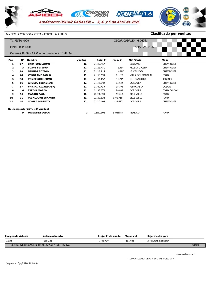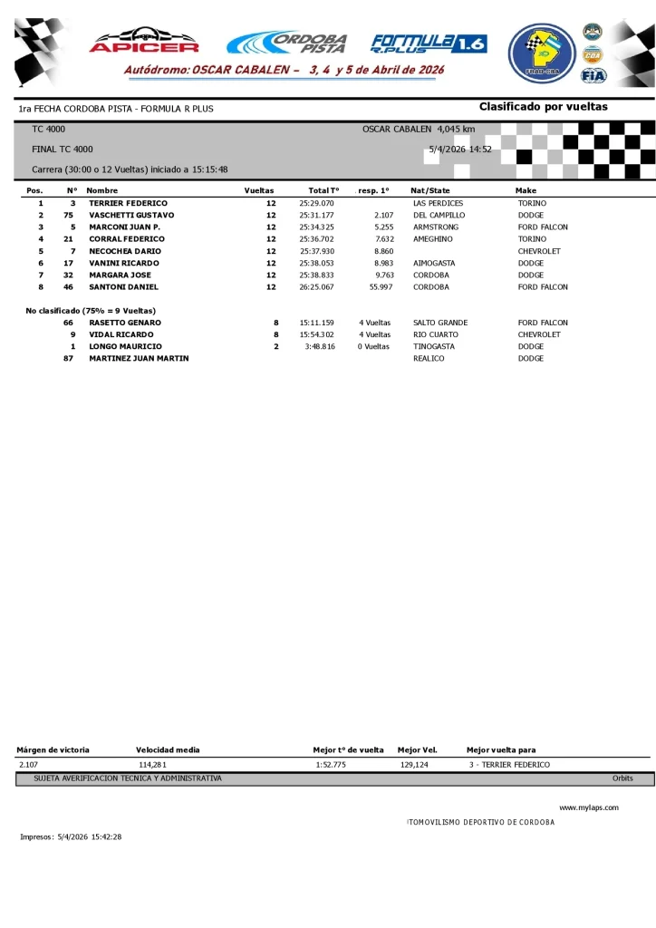 El Autódromo «Oscar Cabalén» de Villa Parque Santa Ana (Córdoba) fue testigo de una jornada de definiciones vibrantes y paridad absoluta en pista. En la máxima divisional, Federico Terrier impuso condiciones para llevarse el triunfo en el TC4000, mientras que Guillermo Saby hizo lo propio con autoridad en el TC Pista 4000. Por el lado de los modelos de la marca italiana, Exequiel Ronga se quedó con la victoria en el Turismo FIAT 128, al tiempo que Gonzalo Viel celebró en lo más alto del podio dentro del Turismo FIAT.
