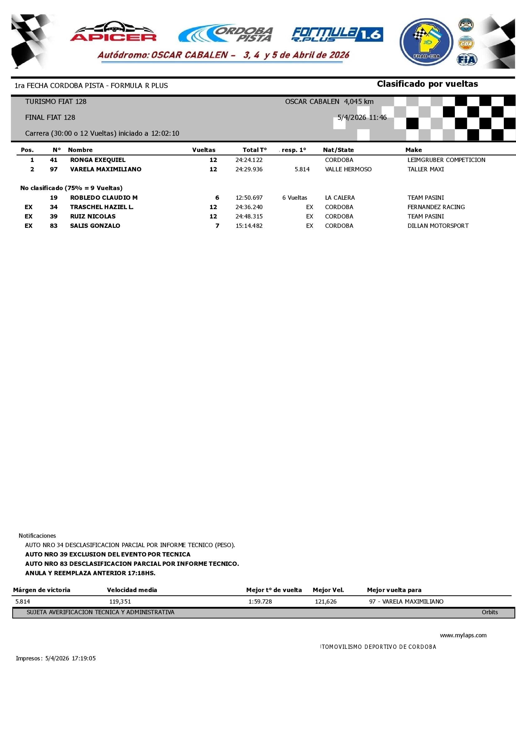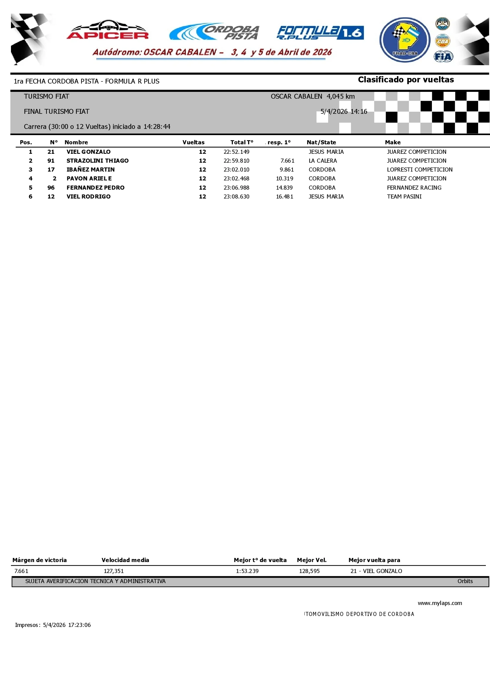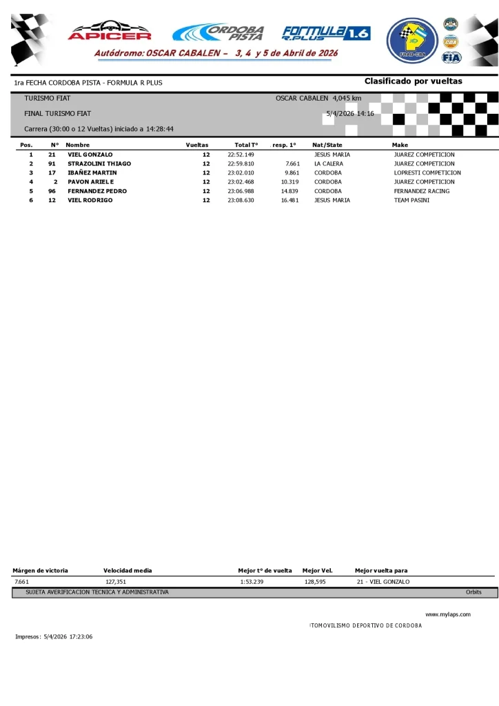 Resultados Carrera Final Turismo FIAT