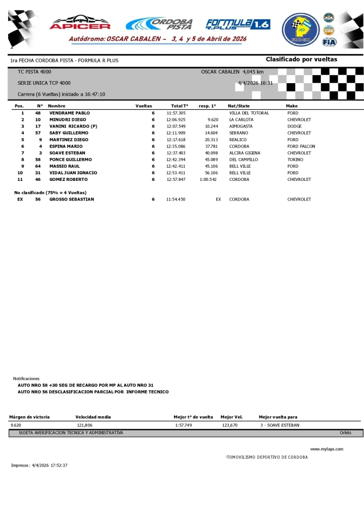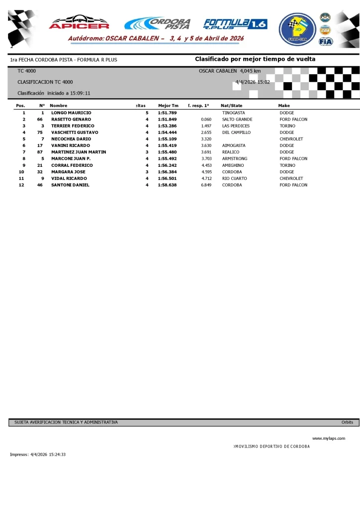 El Córdoba Pista disputó su actividad sabatina en el Autódromo «Oscar Cabalén» de Villa Parque Santa Ana (Córdoba), donde es la sede de la cita Apertura del certamen 2026. En esta ocasión, bajo la lluvia, se desarrollaron las pruebas de Clasificación para el TC4000, el Turismo FIAT Uno y el Turismo FIAT 128, y la Serie única para el TC Pista 4000.