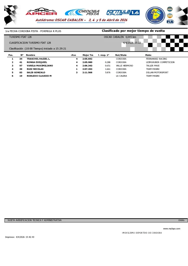 En una clasificación sumamente disputada y con márgenes mínimos, Haziel Lio Traschel se adjudicó la «pole position» del Turismo FIAT 128 sobre el Valle de Paravachasca. El representante de Córdoba Capital, al mando de la unidad del Fernández Racing, logró imponer un ritmo contundente para cerrar la vuelta rápida de la jornada.