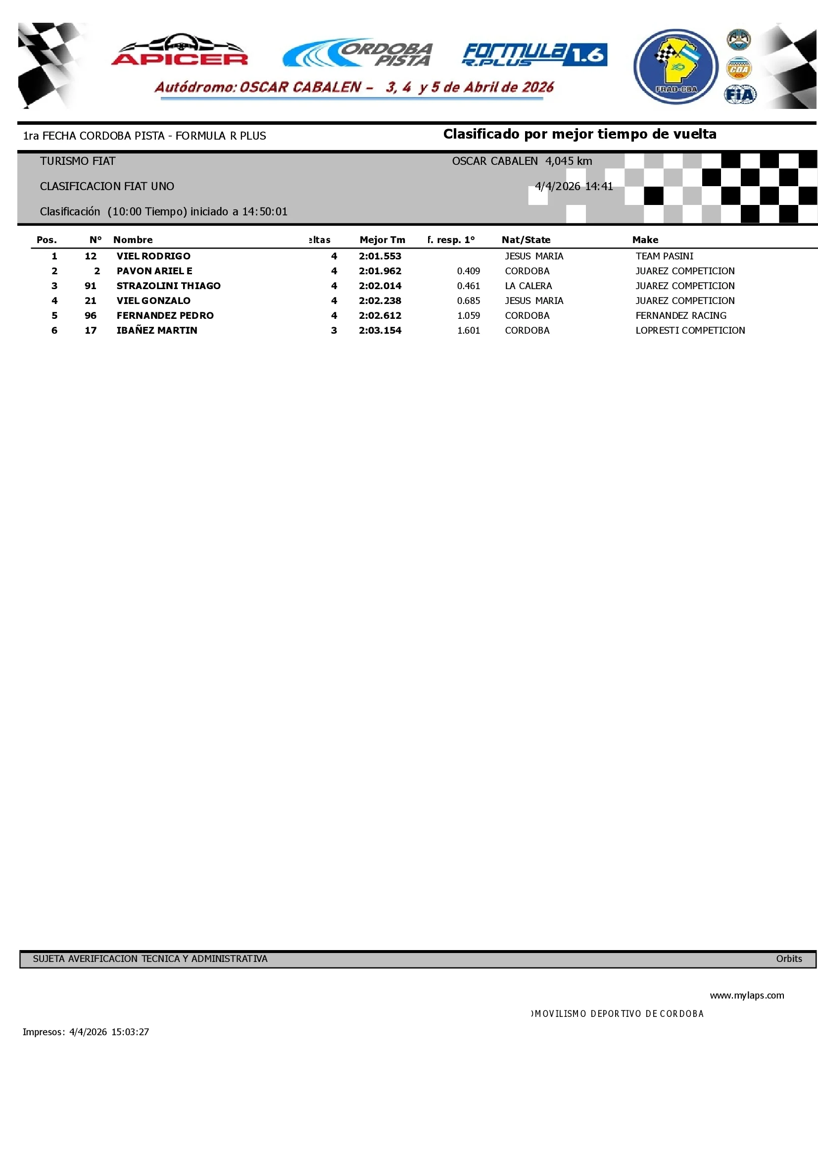 Resultados Clasificación FIAT Uno