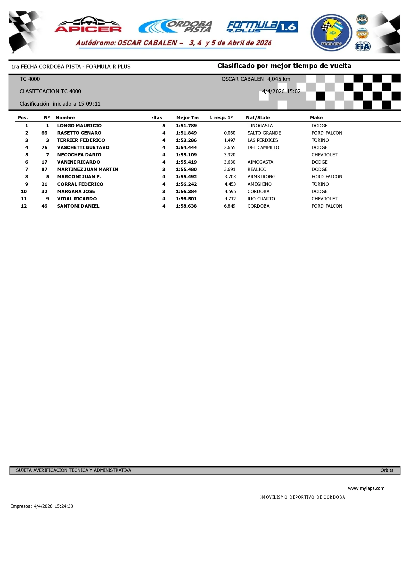 Mauricio Longo reafirmó su jerarquía en el TC4000. El actual monarca de la categoría, al mando de la Dodge atendida por Mecánica Gómez, se adueñó de la «pole position» en una clasificación vibrante disputada en el Autódromo «Oscar Cabalén».