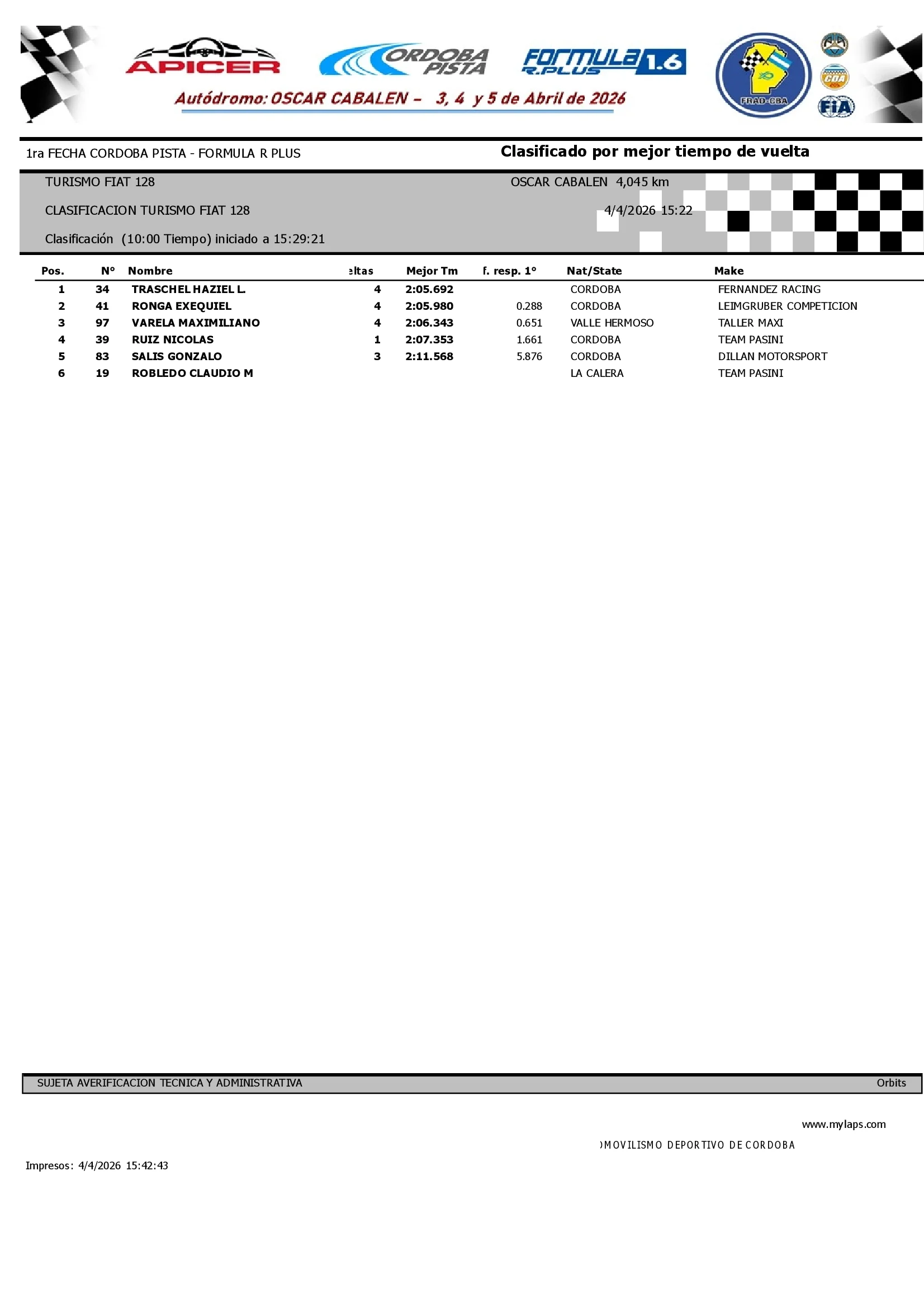 En una clasificación sumamente disputada y con márgenes mínimos, Haziel Lio Traschel se adjudicó la «pole position» del Turismo FIAT 128 sobre el Valle de Paravachasca. El representante de Córdoba Capital, al mando de la unidad del Fernández Racing, logró imponer un ritmo contundente para cerrar la vuelta rápida de la jornada.