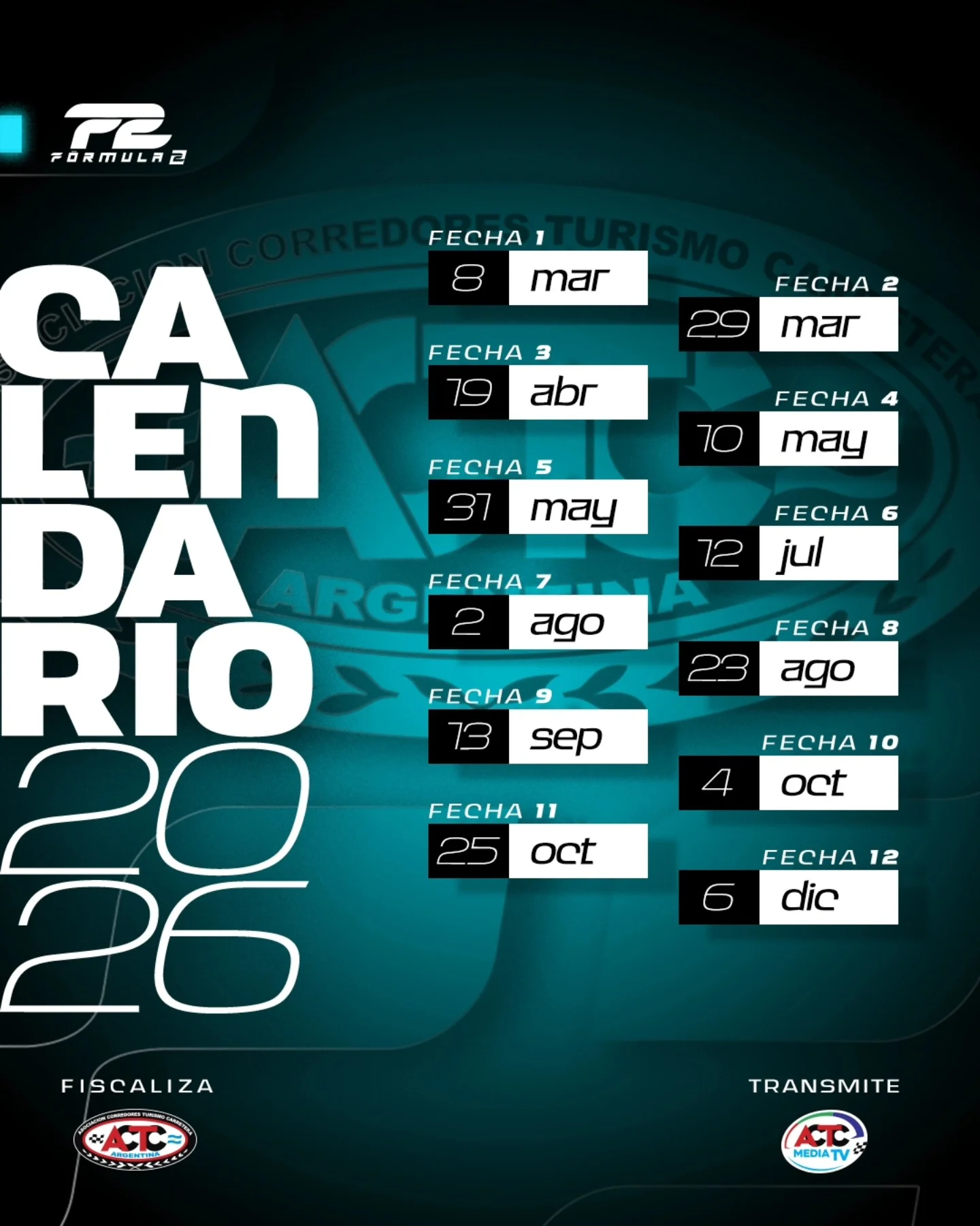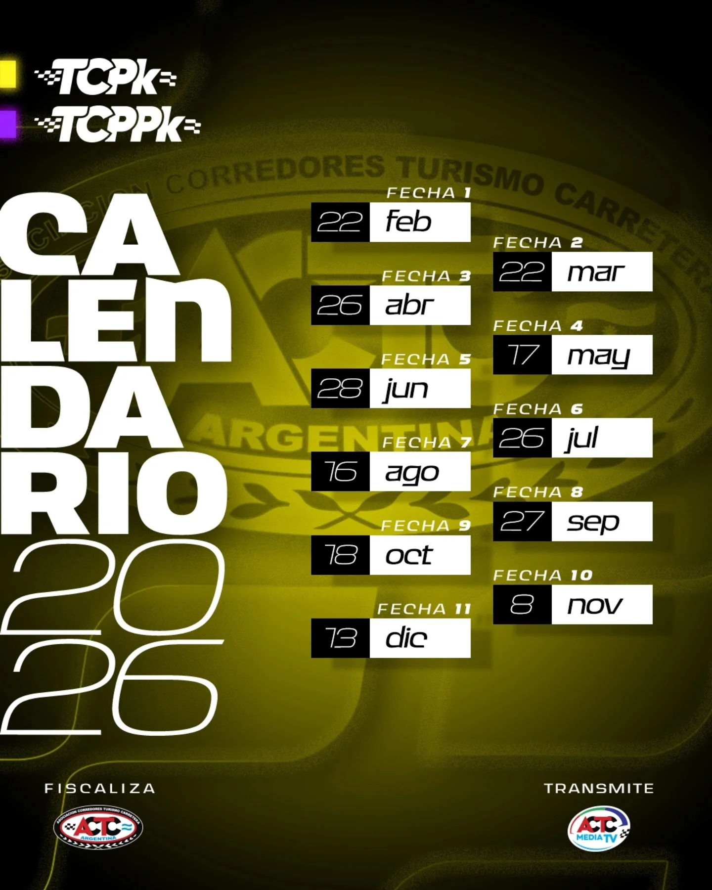 La ACTC dio a conocer el calendario oficial para la temporada 2026 de Turismo Carretera y TC Pista. Tal como se preveía, el campeonato contará con un total de 15 fechas, iniciando la actividad en el mes de febrero y finalizando en diciembre con el Gran Premio Coronación.