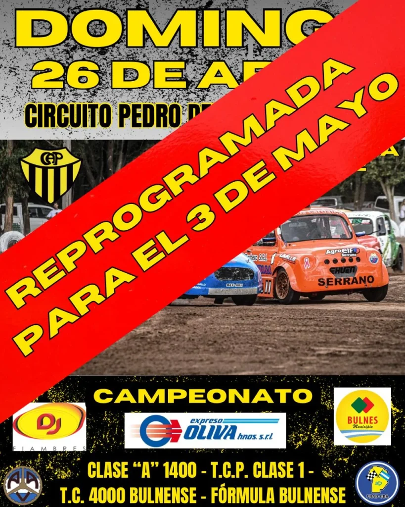 La Subcomisión de Automovilismo informa que debido a las lluvias caídas en los últimos días, y las lluvias que se preveen para el día sábado, la segunda fecha programada para este domingo 26, se reprograma para el domingo 3 de Mayo.