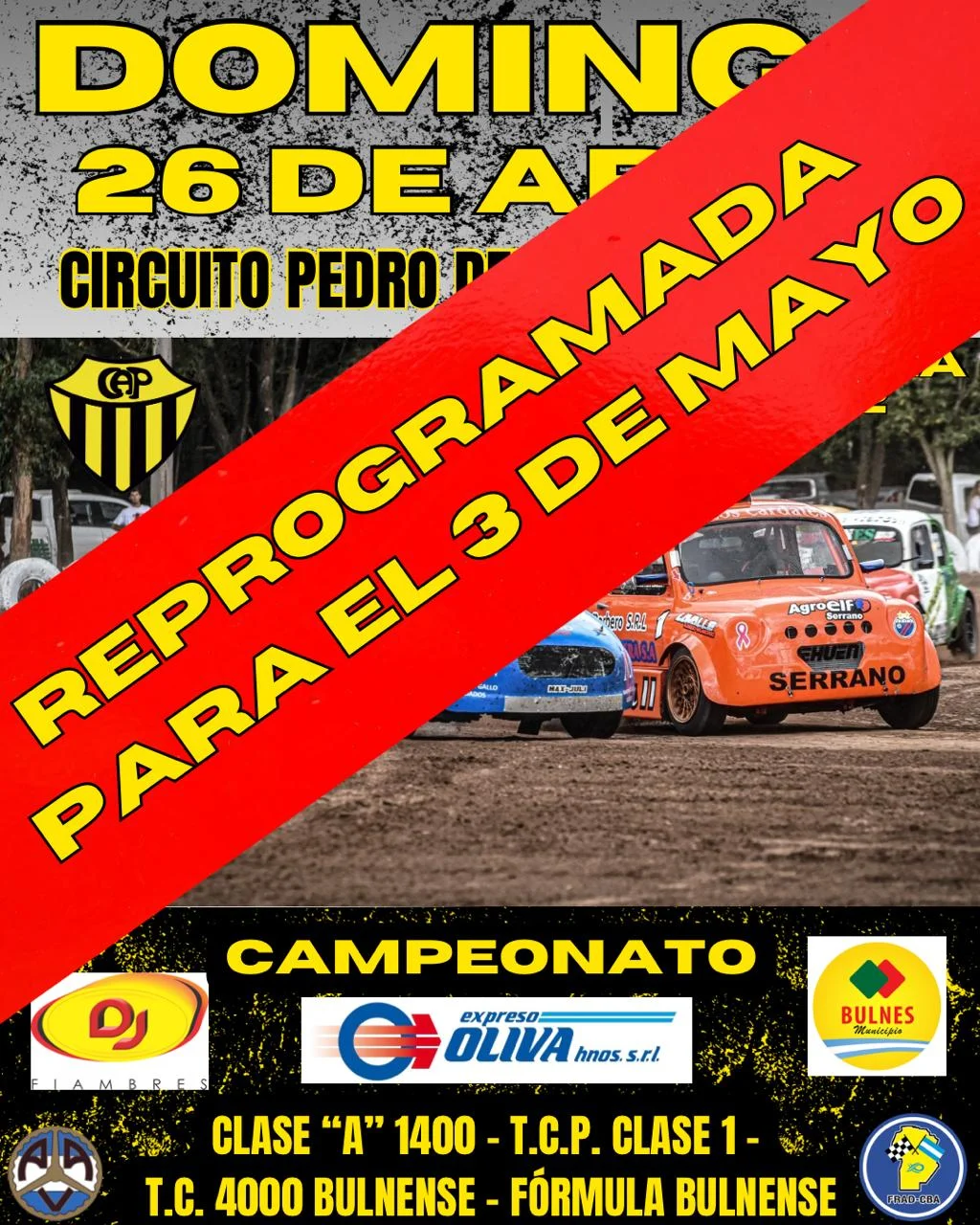 La Sub Comisión de Automovilismo del Club Atlético Peñarol, confirmó este martes la postergación del segundo compromiso del 49° Campeonato Regional Bulnense, que estaba pactado para este domingo en el Circuito «Pedro Devalle» de Bulnes, Córdoba.