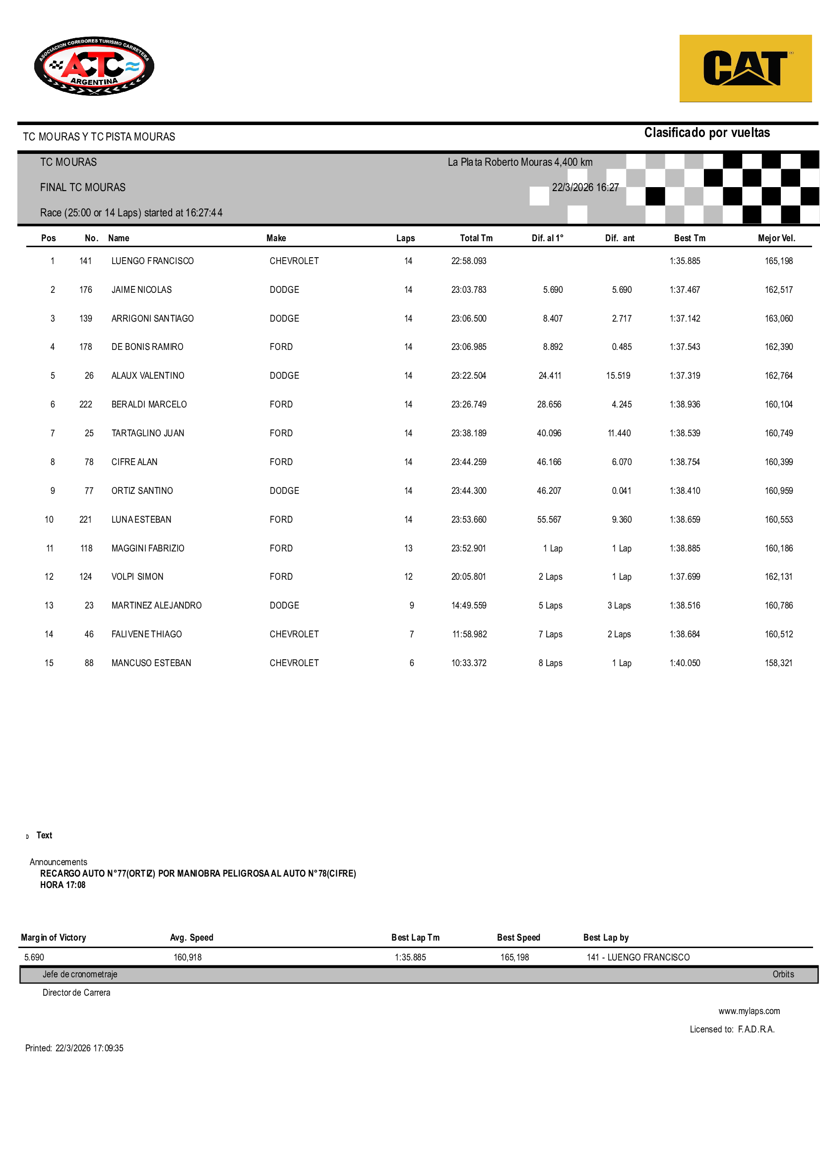 Se cerró la tercera fecha del campeonato 2026 de TC Mouras en el autódromo «Roberto Mouras» de La Plata, en donde el triunfo se lo llevó Francisco Luengo con el Chevrolet del Ré Competición con una holgada distancia sobre Nicolás Jaime y Santiago Arrigoni (ambos con Dodge), con quien mantuvo una fuerte lucha por el primer lugar y al cual logró superar con una maniobra certera por el radio externo del curvón.
